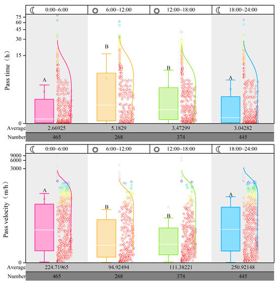 Diurnal and nocturnal rhythms of fish passage are crucial indicators for assessing and managing fishway effectiveness. Analysis of the upstream patterns and passage efficiency of fish during daytime and nighttime can offer a theoretical basis for fishway operation conditions and ecological scheduling. Here, we examined the diurnal and nocturnal rhythms of the passage of fish within the fishway by dividing the monitoring period into four time intervals: nighttime (18:00–24:00), early morning (0:00–6:00), morning (6:00–12:00), and afternoon (12:00–18:00). The average passage time, speed, and the number of successful passages for fish during each time interval were calculated (Figure 7).