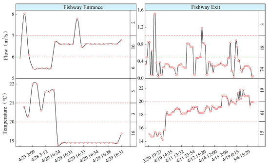 The upstream behavior of S. wangchiachii was monitored in response to environmental changes, thereby identifying the threshold values of environmental factors suitable for fish migration (Figure 8). The flow rate at the fishway entrance comprised both the water supplied through the channel and the fishway flow. Regarding the impact of flow rate and temperature on the number of fish attracted to the entrance, 24 short-finned eels were attracted to the fishway entrance. The number of fish that successfully reached the entrance was the highest and the attraction effect was the best when the total flow rate was between 6 and 7 m3/s and the temperature was between 19 °C and 20 °C. The best upstream passage effect was observed when the fishway flow rate was between 0 and 0.5 m3/s and the temperature was between 17 °C and 20 °C.