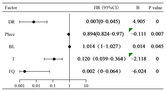 Table 2 presents the optimal model for fishway entrance attraction effects. The model using the fishway flow rate, temperature, fish body length, release location, and diurnal/nocturnal rhythms as independent variables exhibited the lowest AIC value, indicating that it is the best-fitting model. According to the coefficient estimates in the Cox proportional hazards regression model (Figure 9), diurnal/nocturnal rhythms, release location, temperature, and fishway flow rate were inhibitory factors that negatively correlated with successful upstream passage. By contrast, fish body length was positively correlated with successful upstream passage. Specifically, the fishway entrance attraction rate was higher during the night than during the day (HR = 0.007, p < 0.01). When the release location was closer to the fishway entrance, the attraction effect at the fishway entrance was stronger (HR = 0.895, p < 0.01). Within a certain range, lower temperatures resulted in better attraction effects at the fishway entrance (HR = 0.120, p < 0.01). Similarly, lower fishway flow rates resulted in better attraction effects at the fishway entrance (HR = 0.002, p < 0.01). Fish body length was identified as a promoting factor, and within a specific range, larger fish exhibited better attraction effects at the fishway entrance (HR = 1.014, p < 0.05).