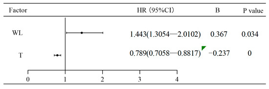 Table 3 presents the optimal model for fishway passage effectiveness. The model using temperature and water level as independent variables exhibited the lowest AIC value, confirming it as the optimal model. According to the coefficient estimates from the Cox hazard ratio regression model (Figure 10), temperature is an inhibitory factor and is negatively correlated with the probability of successful upstream migration. Within a certain range, lower temperatures led to better effectiveness of fishway passage (HR = 0.749, p < 0.001). Water level, on the other hand, was a promoting factor, and within specific limits, higher water levels resulted in better passage effectiveness (HR = 1.443, p = 0.034).
