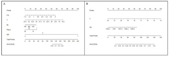 In this study, predictive probability contour plots for fishway entrance attraction and upstream success were established based on AIC values and the Cox hazard ratio regression model (Figure 11). These plots predict success probability in a scoring format by considering the influence of various factors. In the first column of the figure (Points), scores are assigned to each environmental factor. Summation of the scores for all factors provided the corresponding total score (Total Points). Finally, the success probability was estimated through this scoring system.
