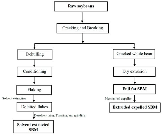 Soybean Processing Using Solvent Extraction and Extrusion Processing. Raw soybeans dried using ambient air to less than 12% moisture required for the processing and production solvent-extracted SBM or full-fat SBM. A mechanical expeller further processes full-fat SBM to produce extruded expelled SBM [44].
