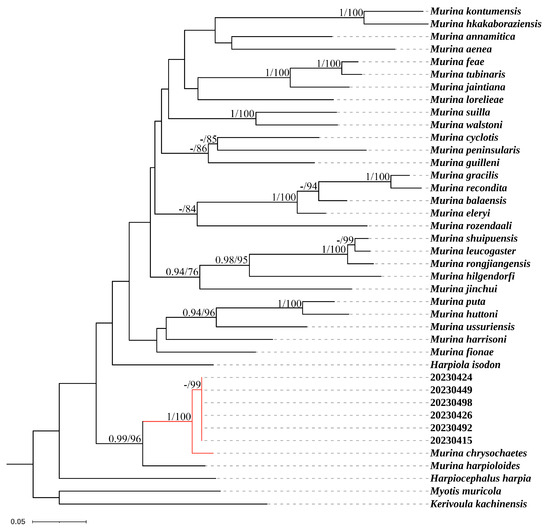Simmons [16] confirmed the presence of 17 species within the Murina genus. Since then, enhanced capture techniques and advances in molecular approaches have led to the description of various new species within the genus [1,4,5,6,7,8,9,10,11,12,14,17,18,19,20,21]. At present, 41 species are listed in the Global Biodiversity Information Facility (GBIF), with 21 species distributed in China according to the Catalogue of Mammals in China [22].