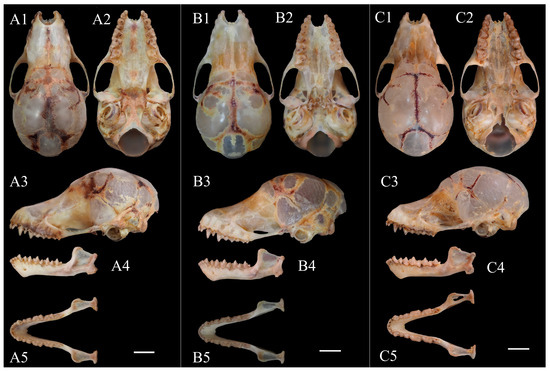 Skull of Murina yuanyang sp. nov. (A) Holotype (KIZ20230424); (B) paratype (KIZ20230450); (C) paratype (KIZ20230415). (1) = Dorsal view of skull; (2) = ventral view of skull; (3) = lateral view of skull; (4) = lateral view of mandible; (5) = occlusal view of mandible. Scale = 2 mm.