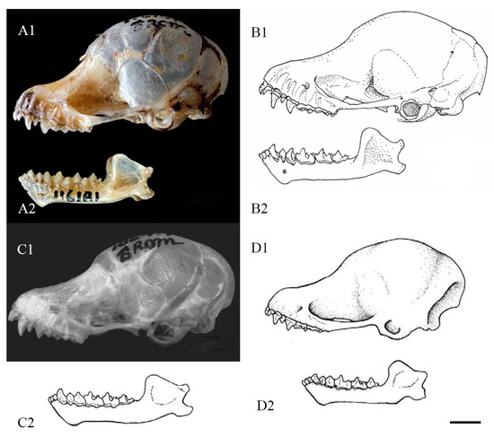 Lateral view of skulls from principal species within the Murina genus for comparative analysis, sourced from the literature. (A) M. chrysochaetes [18]; (B) M. harpioloides [17]; (C) M. eleryi [1,7]; (D) M. aurata [7]. (1) = maxilla; (2) = mandible. Scale = 2 mm.