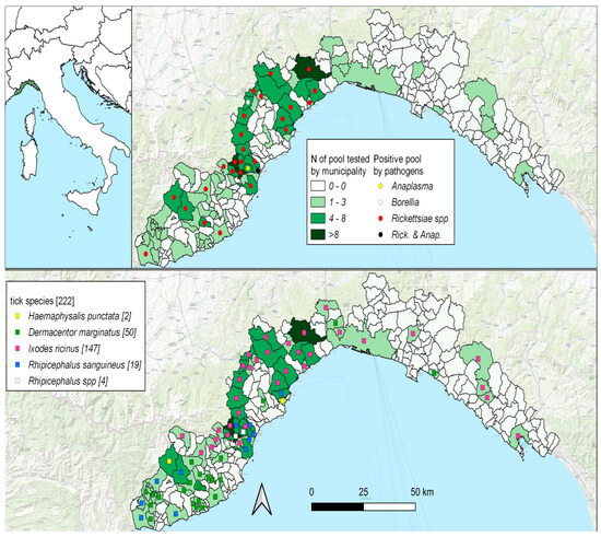 Distribution of tick species and positive pools by pathogens at municipality level.