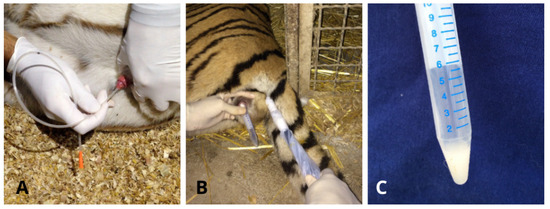 - Fukui, D.; Nagano, M.; Nakamura, R.; Bando, G.; Nakata, S.; Kosuge, M.; Sakamoto, H.; Matsui, M.; Yanagawa, Y.; Takahashi, Y. The effects of frequent electroejaculation on the semen characteristics of a captive Siberian tiger (Panthera tigris altaica). J. Reprod. Dev. 2013, 59, 491–495. [Google Scholar] [CrossRef]