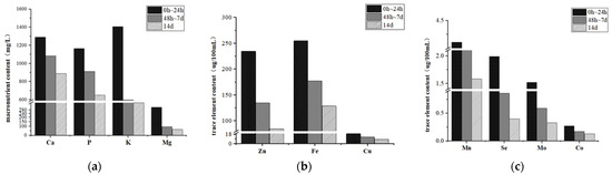 26] also noted that the concentrations of Ca, P, and Mg in horses’ milk decreased as lactation progressed. The present study concluded that Ca, P, K, Mg, Fe, Cu, Mn, Zn, Co, Se, and Mo concentration changes in jennies’ milk followed a similar pattern. These mineral concentrations gradually decreased with the prolongation of the postpartum period and were highest at 0 h postpartum, and then rapidly decreased after 24 h postpartum, and mostly stabilized on day 7 postpartum.
