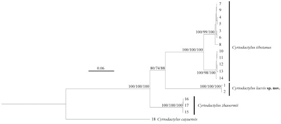 The two unnamed Cyrtodactylus specimens clustered together (SH 100/UFB 100/BI 100), forming a sister lineage (SH 80/UFB 74/BI 88) to the C. tibetanus clade, although the nodal support was moderately weak (Figure 2). However, relatively deep lineage differentiation with further genetic distances and morphological characters confirmed it should be identified as a new taxon.
