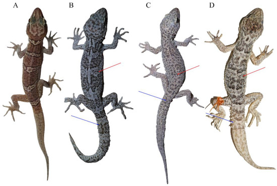 Morphological comparisons of species in the Cyrtodactylus tibetanus group: (A) C. laevis sp. nov. (CIB 121655), (B) C. tibetanus (CIB QZ2021214), (C) C. tibetanus (CIB QZ2021219), and (D) C. zhaoermii (CIB XZ2024101). Red arrows indicate the tubercles on dorsum and blue arrows indicate the tail segments and the tubercles on tails. (A–C) Photos by Sheng-Chao Shi, and (D) photo by Shun Ma.