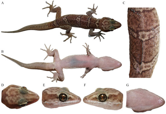 Total views of the Cyrtodactylus laevis sp. nov. (CIB 121654) holotype in preservative: (A) total dorsal view of body, (B) total ventral view of body, (C) dorsal view of medium dorsum, (D) dorsal view of head, (E) right-side view of head, (F) left-side view of head, and (G) ventral-side view of head. Photos by Shun Ma.