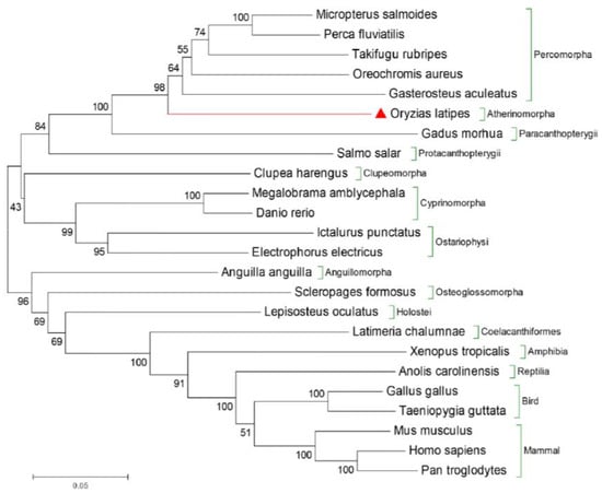 Phylogenetic reconstruction of Dmrt3 in vertebrates. The branching between medaka and others was deduced by using MEGA 7.0 software using Poisson correction distance based on the neighbor-joining method with 1000 bootstrap replicates. The numbers next to the branches represent bootstrap values. The medaka is marked by the red triangles. Brackets represent the orders of various species used. Green brackets represent different orders.