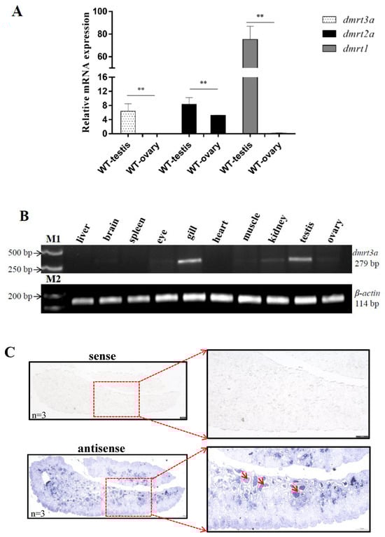 RNA expression of dmrt3a. (A) Transcriptome data analysis of medaka gonads from our laboratory. (B) SqRT-PCR was performed with cDNA from different tissues of adult medaka, with β-actin acting as an internal control. M1: DL 5000 DNA Marker. M2: DL 1000 DNA Marker. The lengths of the amplification products were 279 bp and 114 bp, respectively. (C) Expression of dmrt3a in adult testis by RNA in situ hybridization. The mature testis was hybridized with both sense and antisense RNA probes to detect the expression levels of dmrt3a. The details have been framed in red box and enlarged. The red arrow indicates the position of some dmrt3a in the testis. Scale bar = 100 µm. Original gels are presented in Supplementary Figure S2. **: p < 0.01.