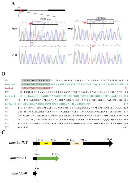 Utilizing CRISPR/Cas9 technology, we knocked out the dmrt3a gene in medaka. Targeting the upstream of the conserved DM domain, we obtained two homozygous mutants, dmrt3a-8−/− and dmrt3a-11−/− (Figure 3A), which were confirmed by PCR and T7 Endonuclease I (Figure S2). Analysis showed that these mutants produce truncated Dmrt3a proteins of 147 and 15 amino acids, respectively, with both of them lacking the DM domain (Figure 3B,C), indicating a functional deficiency.