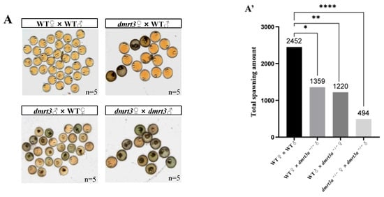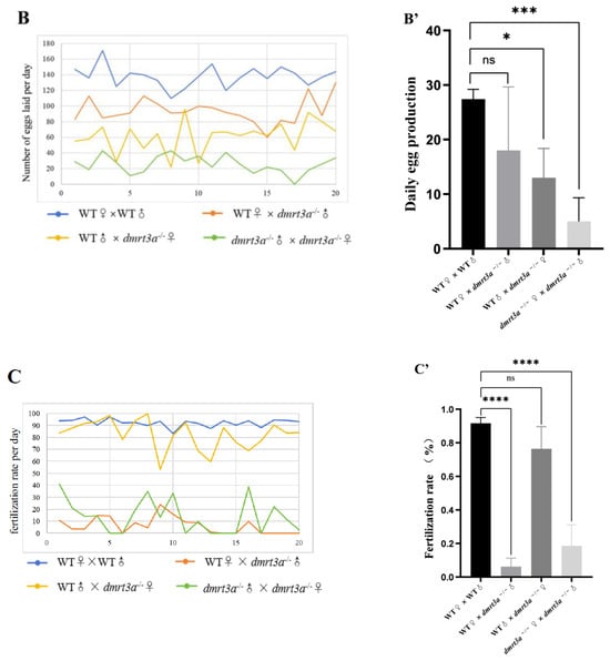 Comparison of fertility between WT and dmrt3a−/− adult medaka. (A) Embryos of medaka intercrossed as WT♀× WT♂, WT♀ × dmrt3a−/−♂, WT♂ × dmrt3a−/−♀ and dmrt3a−/−♂ × dmrt3a−/−♀. (A′) The total numbers of eggs laid by the four groups of experimental fish over a 20-day period. (B) The line chart of the number of eggs laid in each group every day. (B′) The average ovulation numbers of different intercrossed adult medaka groups for 20 days. (C) The line chart of fertility rates every day in the five groups. (C′) Fertility rates of different intercrossed adult medaka groups for 20 days. All dates above are shown as means ± SDs and the experimental period was 20 days. Five balances were set for each group. ♂: male. ♀: female. “ns”: no significant difference. *: p < 0.05. **: p < 0.01, ***: p < 0.001. ****: p ≤ 0.0001. ns: no significance. Scale bar: 5 mm.