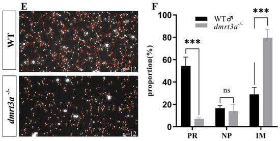 To further study the reason underlying reproductive dysfunction in dmrt3a−/− males, we conducted a histological examination of the testes of WT and dmrt3a male mutants at the age of 6 months. Compared to the WT, no significant difference in appearance was observed in the dmrt3a−/− testes (Figure 5A,B). However, mutants had larger reticular vacuolar tissue in the testes (Figure 5A′,B′) and a decrease in the number of mature sperm in the seminal vesicles (Figure 5A″,B″). TUNEL detection revealed a significant increase in the apoptosis rate of dmrt3a−/− testicular somatic cells (Figure 5C,C′,D,D′). Additionally, the motility of sperm from two groups was analyzed using a sperm analyzer at 6 months of age. As shown in the sperm motility trajectory in Figure 5E, sperms of the dmrt3a mutant almost lost their motility compared with the WT. After multiple repetitions and statistical analyses, it was found that the dmrt3a−/− mutant had 7% sperm with forward movement (PR), 14% sperm with non-forward movement (NP), and PR + NP = 21%, while the WT group had 54% sperm with forward movement (PR), 17% sperm with non-forward movement (NP), and 71% sperm with PR + NP (Figure 5F). According to the fourth edition of the WHO Laboratory Manual for Human Semen Examination and Treatment, the dmrt3a mutant male fish appeared asthenozoospermia. Furthermore, we also further collected the videos of spermatozoa from WT and mutant and found that sperm count and sperm motility were significantly lower in mutant compared to WT medaka (Videos S1,S2).