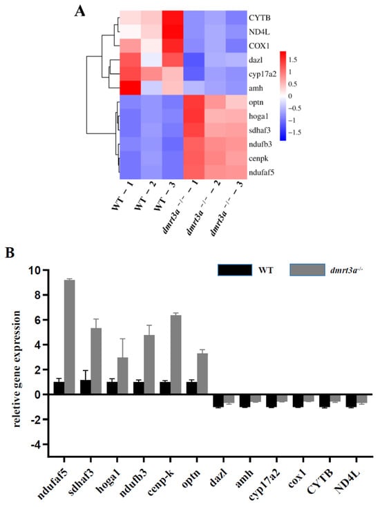 Subsequently, to validate the reliability of the transcriptome data, we performed qRT-PCR on 12 differentially expressed genes involved in mitochondrial respiratory chain, spermatogenesis, and germ cell maker genes in the transcriptome. The clustering heatmap of the 12 genes was generated by the relative RNA expression in WT and dmrt3a−/− medaka from transcriptomic data (Figure 6A). The results indicated that the data obtained from the transcriptome were consistent with the results of qRT-PCR (Figure 6B). Therefore, transcriptome data are effective and reliable.