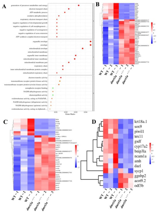 To further trace the molecular mechanism of dmrt3a, we conducted GO and KEGG enrichment analysis on differentially expressed genes between the dmrt3a mutant and wild type. The results indicated that the top 30 pathways, including the molecular function (MF), biological process (BP), and cell component (CC) pathways, were primarily associated with the electron transport chain, oxidative phosphorylation, the generation of precursor metabolites, ATP synthesis, and other processes relevant to the structure and energy of mitochondria (Figure 7A). In addition, the top KEGG pathway was oxidative phosphorylation (Table S4). Clustering analysis showed the upregulated and downregulated genes in the pathways of oxidative phosphorylation and the electron transport chain (Figure 7B,C). We found that the genes of mitochondrial DNA (mtDNA) including ND1, ND2, ND4, ND4L, ND5, and ND6, which are related to the formation of energy transfer respiratory chains, were all significantly downregulated. Moreover, the genes associated with spermatogenesis, sperm quality, mitochondrial energy, and structure, including COX1, COX2, CYTB, ATP6, and ATP8, were significantly downregulated [,] (Table S5). Meanwhile, a significant change was observed in the expression of spermatogonia marker genes and androgen synthesis levels, including dazl, piwil1, and cyp17a2 (Figure 7D; Table S6). Based on the aforementioned results, it can be inferred that the knockout of dmrt3a led to a significant disruption in the internal homeostasis of mitochondrial material synthesis and decomposition, particularly during spermatogenesis and sperm motility. The disruption was likely to impair sperm development and function, ultimately resulting in reduced fertility in male medaka.