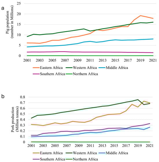 Trends in pig population and pork production across African regions from 2001 to 2021. (a) Pig population (in millions) by region, showing the highest populations in Eastern and Southern Africa (b) Pork production (in million tonnes) by region, with Eastern Africa leading in production, followed by Southern Africa [].