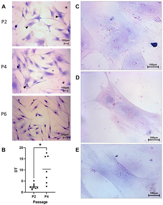 Cell morphology with Giemsa staining. (A) Microscopic images (20×) in passages 2, 4, and 6. Similar cell morphology is observed in passages 2, 4, and 6 in this individual. Binucleated cells are indicated with a black arrowhead. (B) Doubling time (DT) assay showed an increase in P4 (* p = 0.01). (C) Multinucleated cell with 4 defined nuclei. (D) Rectangular-shaped cell with 3 nuclei stained with Giemsa. (E) Karyolitic cells, fragmented chromatin, and no defined nuclear membrane are observed.