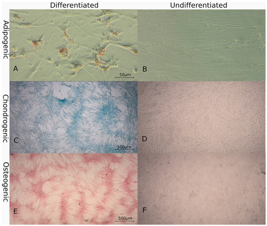 Trilineage differentiation of cat adipose tissue-derived mesenchymal stromal/stem cells in passage 2. Microscopic images of (A) adipogenic differentiation stained with Oil Red O showing lipid vacuoles (40×), (C) chondrogenic differentiation stained with Alcian blue showing a matrix rich in glycosaminoglycans (10×), and (E) osteogenic differentiation stained with Alizarin red showing calcium deposits (10×). (B,D,F) Undifferentiated controls, (B) at 40× and (D,F) at 10×.