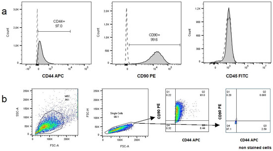 Immunophenotypic analysis of cat adipose tissue-derived mesenchymal stromal/stem cells (cAT-MSCs). (a) Representative histograms of CD90, CD44, and CD45 expression of cAT-MSCs (dashed line on each histogram represents non-stained cells). (b) Dot plots representing the gating strategy employed: cells were gated based on forward scatter (FSC) and side scatter (SSC) properties, single cells were then selected and CD90 and CD44 expression was analyzed. Representative dot plots of CD44 vs. CD90 expression of cAT-MSCs and non-stained cells are shown. All cAT-MSCs cells were CD45 negative. FITC = fluorescein isothiocyanate; APC = allophycocyanin; PE = phycoerythrin.