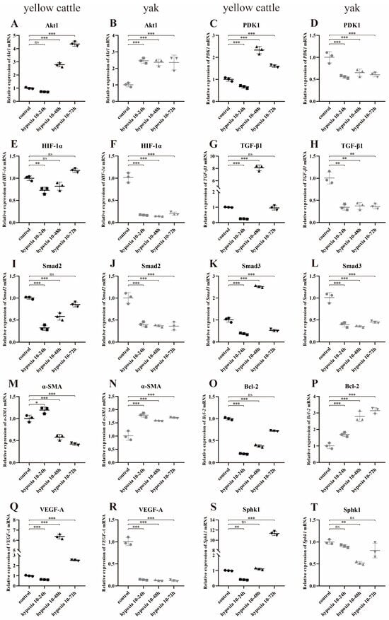 Meanwhile, with the change in cell hypoxia incubation time, the trends of Akt1, HIF-1α, Smad2, Bcl-2, SphK1, and Snail mRNA relative expression in yellow cattle PASMCs were consistent and increasing, and all of them had the highest expression at 10–72 h of hypoxia (Figure 15A,E,I,O,S,U); α-SMA was opposite and had the highest expression at 10–24 h of hypoxia (Figure 15M); the relative expression trends of PDK1, TGF-β1, Smad3, VEGF-A, and Gal-3 mRNAs were consistent with each other, showing an increasing and then decreasing trend, and all of them had the highest expression at 10–48 h of hypoxia (Figure 15C,G,K,Q,W). In yak PASMCs, except for Bcl-2 mRNA relative expression, which showed an increasing trend and was highest at 10–72 h of hypoxia (Figure 15P), and SphK1 mRNA relative expression, which showed a decreasing and then increasing trend and was lowest at 10–48 h of hypoxia (Figure 15T), the relative mRNA expression of the remaining genes did not change significantly (Figure 15B,D,F,H,J,L,N,R,V,X).