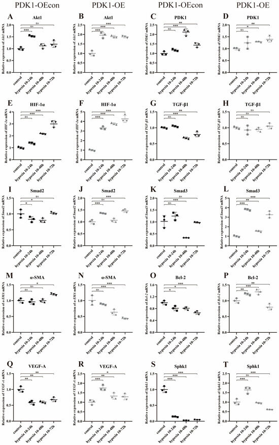 Meanwhile, with the change in hypoxia time, the relative expression of Akt1, TGF-β1, and Smad2/3 mRNA in PDK1-OEcon had a consistent trend of decreasing and then increasing, and all had the highest expression at hypoxia 10–24 h (Figure 17A,G,I,K); the relative expression of PDK1 mRNA had a trend of increasing and then decreasing, and had the highest expression at hypoxia 10–48 h (Figure 17C); the relative expression of HIF-1α, α-SMA, VEGF-A, and Gal-3 mRNA showed an increasing trend, and HIF-1α and α-SMA mRNA had the highest expression at hypoxia 10–72 h, and the expression of VEGF-A and Gal-3 mRNA was lower in hypoxia than the control group in each different time period (Figure 17E); the control group (Figure 17E,M,Q,W); the relative expression of Bcl-2, SphK1, and Snail mRNA showed a consistent trend of decreasing, all with the highest expression at hypoxia 10–24 h and lower than that of the control group (Figure 17O,S,U). The relative expression of PDK1 and HIF-1α mRNA in the PDK1-OE group showed an increasing trend, with the highest expression at hypoxia 10–72 h (Figure 17D,F); the relative expression of Smad2/3 and Gal-3 mRNA showed a decreasing and then increasing trend, both with high expression at hypoxia 10–24 h and 72 h (Figure 17J,L,X); the relative expression of α-SMA, VEGF-A, SphK1, and Snail mRNA showed a decreasing trend in relative expression, with the lowest expression at hypoxia 10–72 h (Figure 17N,R,T,V); Bcl-2 mRNA showed an increasing and then decreasing trend in relative expression, with the highest expression at hypoxia 10–48 h (Figure 17P). There was no significant change in the relative expression of the other genes (Figure 17B,H).