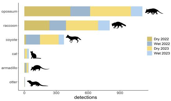 We observed a total of six mesopredator species over the study period, but three species were detected far more than others (Table 2, Figure 2): opossums (ndry = 817, nwet = 294), raccoon (ndry = 538, nwet = 265), and coyote (ndry = 190, nwet = 183). Domestic cats (Felis sylvestris f. catus, ndry = 21, nwet = 22), nine-banded armadillos (Dasypus novemcinctus, ndry = 23, nwet = 18), and river otters (Lontra canadensis, ndry = 2, nwet = 4) were relatively rare. Given that we focused on species with >75 detections per season, we have restricted our analyses to the opossum, raccoon, and coyote. We were unable to identify individuals for all observations, but given that we were able to distinguish differences between many individuals through markings, body size, and specific characteristics like leg limps across all our sites, we are confident our analyses are biologically relevant.