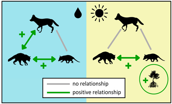 We only found one species detection rate pattern that varied by season: coyotes and raccoons were more often detected in the same area during the wet season but not the dry season. This is an intriguing result since other work has shown that coyote–raccoon home range overlap does not vary by season [85]. Both coyotes and raccoons are highly adaptable generalist species that can survive in multiple habitats, developing strategies that best fit the context available to them [101,102]. Many consider raccoons to be subordinate predators to coyotes, or even prey species, but the nature of the relationship between coyotes and raccoons appears to be nuanced. In the western United States, raccoon detection rates decrease when coyotes are present in an area, suggesting predation by coyotes [43]. However, in the eastern U.S., raccoons do not seem to be fearful of coyotes and have low levels of vigilance in coyote-inhabited areas [97]. Given our lack of evidence for predation, it is likely that coyotes and raccoons are sharing food resources during the wet season when food is more plentiful.