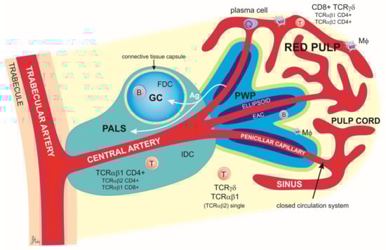 - Jeurissen, S.H.M. Structure and Function of the Chicken Spleen. Res. Immunol. 1991, 142, 352–355. [Google Scholar] [CrossRef] [PubMed]