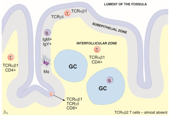 - Nagy, N.; Oláh, I.; Vervelde, L. Structure of the Avian Lymphoid System. In Avian Immunology; Kaspers, B., Schat, K.A., Göbel, T.W., Vervelde, L., Eds.; Academic Press: London, UK, 2021; pp. 11–44. [Google Scholar]