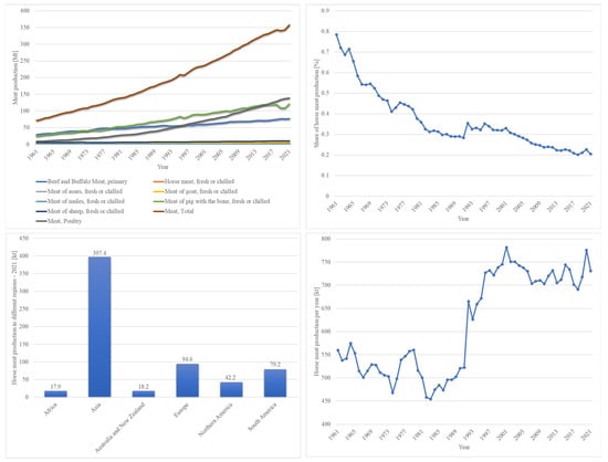 Trends and statistics in global meat production (1961–2021). Top Left: Total global meat production by type (in million tons) from 1961 to 2021. Top Right: Share of horse meat in total meat production (in percentage) from 1961 to 2021, showing a declining trend over the years. Bottom Left: Horse meat production by region (in million tons) in 2021, highlighting Asia as the leading producer. Bottom Right: Annual global horse meat production (in thousand tons) from 1961 to 2021, illustrating fluctuations and an overall increasing trend in recent years [].