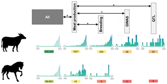 On 29 March 2024, a systematic search was conducted in the PubMed database (https://pubmed.ncbi.nlm.nih.gov/ (accessed on 29 March 2024)) to collate research about the production of horse and cattle meat, looking in particular for literature on genome-wide association studies (GWAS), quantitative trait loci (QTL), and breeding strategies. The search terms and the strategy used for this inquiry are listed in Table S1.