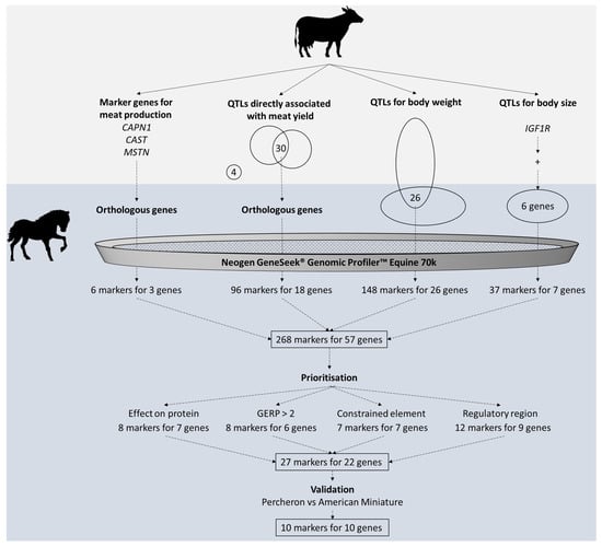 Workflow for identifying and prioritizing SNP markers for horsemeat production traits. Note: The markers in this figure represent unique SNP locations, excluding duplicate SNP probes.