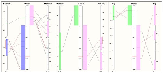 Syntenic block on chromosome 3 in horses. Red rectangles on the horse chromosome indicate the region of orthologous genes associated with dressed carcass muscle weight and dressed carcass muscle-to-bone ratio in cattle.