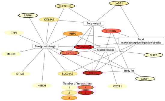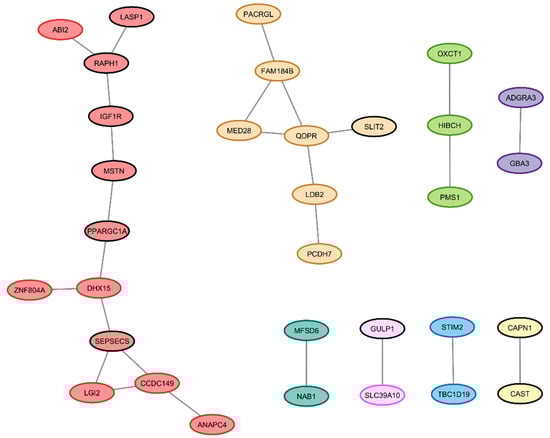 Protein–protein interaction (PPI) network of 43 candidate genes for horsemeat production analyzed using the STRING tool. Nodes circled in black indicate candidate genes with prioritized markers.