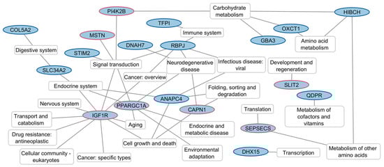 While no single gene ontology term was enriched, 19 genes are annotated in the KEGG database. Analysis of the KEGG pathways reveals that the genes studied are predominantly involved in signal transduction pathways that are central to the regulation of growth, nutrient sensing, and energy homeostasis (ANAPC4, IGF1R, CAPN1, MSTN, PI4K2B, PPARGC1A, RBPJ, STIM2). Associated with this pathway, a significant subset is implicated in the endocrine system, highlighting roles in reproductive function, hormone signaling, and calcium regulation (ANAPC4, IGF1R, PPARGC1A, SLC34A2). Additionally, a notable group is involved in carbohydrate metabolism, emphasizing their contribution to energy production and management in the organism (GBA3, HIBCH, OXCT1, PI4K2B). Other important pathways include nutrient absorption (COL5A2, SLC34A2), transcription (DHX15), translation (SEPSECS), amino acid metabolism (HIBCH, SEPSECS), and protein turnover (ANAPC4, CAPN1). In addition, signaling pathways related to the nervous system (IGF1R, CAPN1, DNAH7, RBPJ, PPARGC1A) and the immune system (RBPJ, TFPI) were detected (Figure 6).
