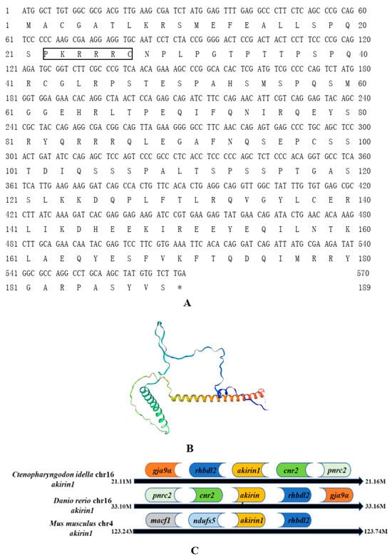(A) The cDNA and deduced amino acids of grass carp akirin1. Box represents NLS motif; the * represents the stop codon. (B) The predicted three-dimensional structure of grass carp akirin1. The model W5KQL2.1.A (Astyanax mexicanus akirin1) was used as the reference model for the predicted spatial structure. (C) Gene synteny and chromosomal location analysis of akirin1. The genes adjacent to akirin1 loci are shown on grass carp and zebrafish chromosome 16 and mouse chromosome 4.