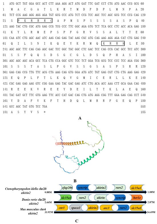 (A) The cDNA and deduced amino acids of grass carp akirin2. Box represents NLS motif; the * represents the stop codon. (B) The predicted three-dimensional structure of grass carp akirin2. The model A8YXY8.1.A (Bos taurus akirin2) was used as the reference model for the predicted spatial structure. (C) Gene synteny and chromosomal location analysis of akirin2. The genes adjacent to akirin2 loci are shown on grass carp and zebrafish chromosome 20 and mouse chromosome 4.