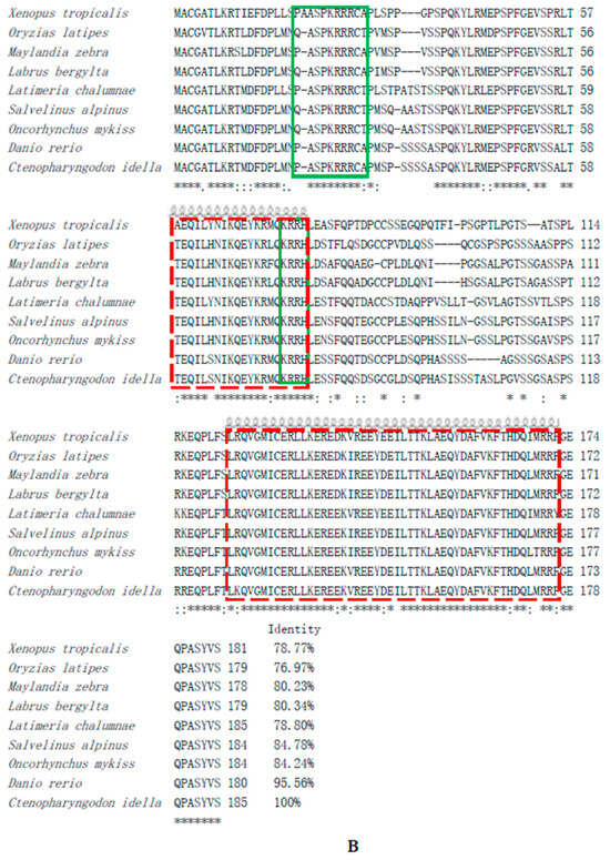 Sequence alignment of grass carp akirin1 (A) and akirin2 (B) with other species. The identical amino acids are noted by (*), and the highly and less conserved amino acids are noted by (:) and (.), respectively. The green box represents NLS motif. The red box represents α-helix motif. The identity of each sequence compared is indicated at the end of the sequences.