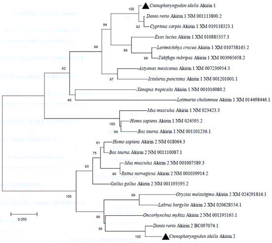 Reverse transcriptase-PCR (RT-PCR) was employed for the cloning of the akirin coding sequences (CDS). The predicted sequences of grass carp akirin1 (GEUQ01031657) and akirin2 (GEUQ01062159) were obtained from the transcriptome shotgun assembly database at the National Center for Biotechnology Information through a sequence alignment with zebrafish (Danio rerio) akirin1 (NM 001113800.2) and akirin2 (BC097074.1) sequences. Total RNA was extracted from the spleen of grass carp, and the first-strand cDNA was synthesized by reverse transcription kit (Takara, Dalian, China). Specific primers designed based on the akirin sequences were synthesized for the purpose of gene cloning. The PCR cycling conditions were as follows: 94 °C for 3 min; followed by 35 cycles of 94 °C for 30 s, 56 °C for 30 s, 72 °C for 1 min; 72 °C, 5 min; and 12 °C for infinity. The SignalP 5.0 server (http://www.cbs.dtu.dk/services/SignalP/ (accessed on 10 May 2023)) was utilized to analyze the signal peptide of akirins. The spatial structure of grass carp akirins was examined using the Swiss model (https://swissmodel.expasy.org/ (accessed on 12 May 2023)). The PSORT (https://www.genscript.com/psort.html (accessed on 15 May 2023)) was used to investigate the nuclear localization signal (NLS) motif of akirins, and the sequence alignment of akirins was evaluated using ClustalW2 (http://www.ebi.ac.uk/Tools/msa/clustalw2/ (accessed on 15 May 2023)). A phylogenetic tree of akirins was constructed with MEGAX using the neighbor-joining method (bootstrap phylogeny test, 2000 replicates).