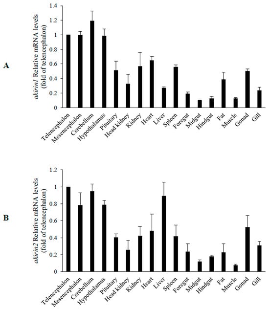 Previous research has indicated the presence of akirin mRNA in various tissues [,]. The widespread distribution of akirins across different tissues is associated with their diverse physiological functions. High levels of akirins have been observed in the brain, kidney, liver, gonad, spleen, and heart of grass carp. Similarly, either akirin1 or akirin2 has been identified in the brain, kidney, liver, and testes of mice [] and Chinese loach []. Furthermore, in blunt-snout bream [] and croaker [], akirins were found to be significantly expressed in the liver, spleen, brain, head kidney, and kidney. These findings suggest that the expression of akirin in nonimmune-related tissues is a common occurrence. The notable presence of akirins in nonimmune-related tissues may be linked to the functions such as reproduction, growth, myogenesis, and other non-immunological processes.