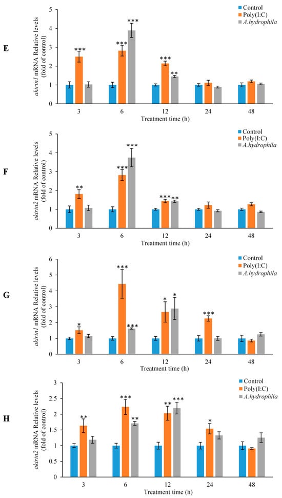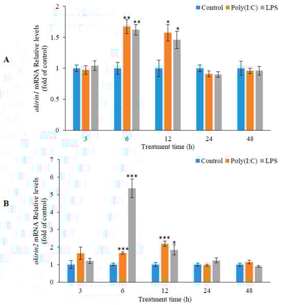 HKLs were isolated using discontinuous density gradient centrifugation, as described previously []. Briefly, grass carp were sterilized with 75% ethanol and then euthanized. The head kidney was collected, washed, and pressed in RPMI-1640 medium. Subsequently, the cell suspension was filtered through a 200 μm nylon mesh and centrifuged on Histopaque®-1083 (Sigma-Aldrich, St. Louis, MO, USA, density 1.083 kg/L) at 4 °C, 500 g for 25 min. The isolated leukocytes were then washed twice with PBS, resuspended in RPMI-1640 medium supplemented with 10% FBS, and seeded at a density of 2 × 106 cells per well in 24-well plates. The cells were then incubated at 28 °C under 5% CO2 and saturated humidity. Following overnight culture, the medium was replaced with fresh RPMI-1640, and the leukocytes were exposed to 25 μg/mL ploy (I:C) or 20 μg/mL LPS for 3, 6, 12, 24, and 48 h. At the conclusion of the experiment, the cells were lysed using RNAiso Plus for RNA extraction, and the expression of akirins was assessed through real-time PCR.