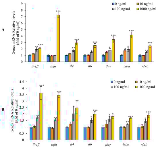 As shown in Figure 10, the real-time PCR results revealed that the mRNA levels of il-1β, il-4, il-6, ifnγ, and nfκb were significantly upregulated following treatment with 100 and 1000 ng/mL of akirin1. Furthermore, the expression of iκbα mRNA was induced by 10, 100, and 1000 ng/mL of akirin1. However, tnfα mRNA levels were notably increased only with 1000 ng/mL of akirin1. Similarly, the mRNA levels of il-1β, ifnγ, il-4, tnfα, il-6, iκbα, and nfκb mRNA were markedly elevated with 100 and 1000 ng/mL of akirin2 treatment (Figure 10).