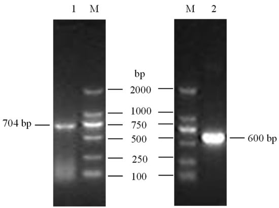 PCR results of clones for buffalo LEP_X1_pMD18-T (704 bp) and LEP_X2_pMD18-T (600 bp). M, Marker-DL2000; 1, LEP_X1_pMD18-T; 2, LEP_X2_pMD18-T. The original electrophoretic gels were in Figure S2.