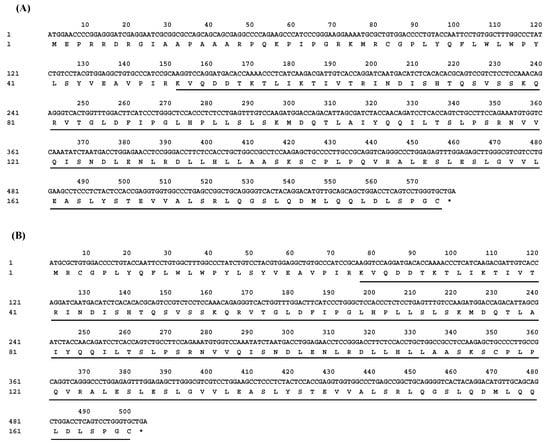 Buffalo LEP_X1 (A) and LEP_X2 (B) CDS obtained in this study and their deduced amino acid sequences. The amino acid sequence is located below the nucleotide sequence. The leptin-conserved domain region is underlined. The stop codon is indicated by an asterisk (*).