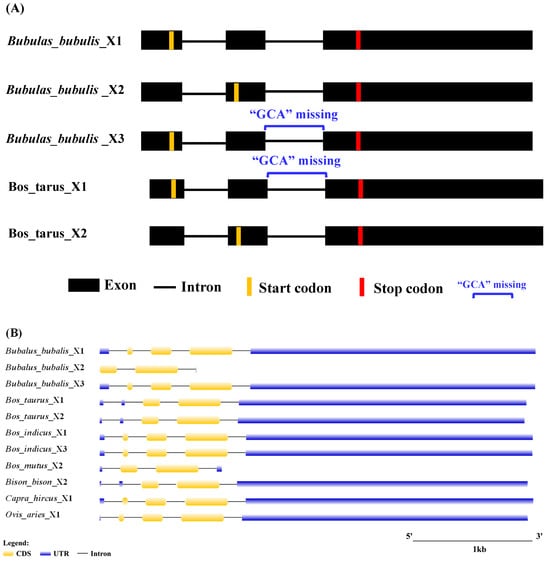 Schematic representation of structural differences in LEP transcript variants between Bubalus bubalis and Bos taurus (A) and transcriptional region structure (B).