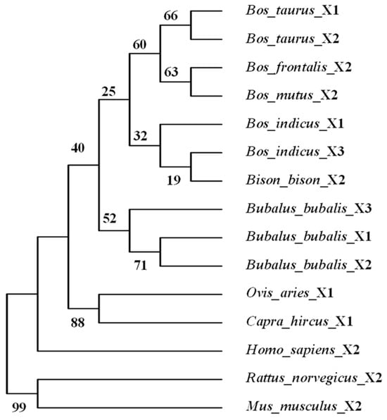 Based on the mRNA sequence of buffalo LEP (Table S1, accession No. XM_044946369.2, X1; NM_001290901.1, X2), primers for isolating and identifying transcript variants of the LEP gene were designed using Primer Premier 5.0 software in Table S2 [18]. The PCR reaction system consisted of 25 µL total volume, including 12.5 µL of 2× Hieff Canace®PCR Master Mix (Dye), 1.25 µL of each primer (10 µmol/L), 1.25 µL of 100 ng/µL cDNA template, and 8.75 µL of sterile water. The PCR procedure included an initial pre-denaturation at 95 °C for 3.5 min, followed by 35 cycles of denaturation at 95 °C for 10 s, annealing at 64.7 °C for 30 s, and extension at 72 °C for 30 s, with a final extension at 72 °C for 5 min. The PCR products were detected by 1.5% agarose gel electrophoresis, purified, and cloned into a pMD18-T vector (TaKaRa, Dalian, China). Ten monoclonal clones of each transcript variant were selected and sequenced bidirectionally by Shanghai Sangon Biotech Co., Ltd, Shanghai, China.