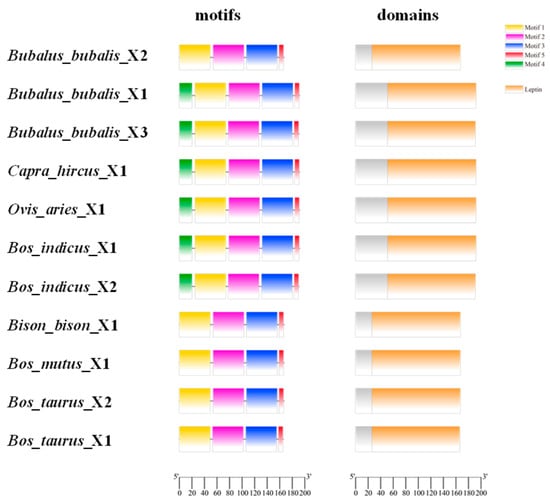 The LEP protein contained a conserved Leptin domain comprising five conserved motifs, designated as motif 1–motif 5. These motifs were similarly present in cattle, zebu, sheep, and goats, while bison, yaks, rats, and mice exhibit four motifs due to differences in the 5’UTR (Figure 5). The secondary structure prediction for buffalo LEP_X1 revealed it was composed of 48.96% α-helix (94 AA), 40.62% random coils (78 AA), 5.73% extended chains (11 AA), and 4.69% β turn (9 AA) (Figure S4A). LEP_X2 comprised 56.29% α-helix (94 AA), 32.34% random coils (54 AA), 5.39% extended chains (9 AA), and 5.99% β turn (10 AA) (Figure S4B). LEP_X3 consisted of 56.02% α-helix (93 AA), 32.53% random coils (54 AA), 5.42% extended chains (9 AA), and 6.02% β turn (10 AA) (Figure S4C).